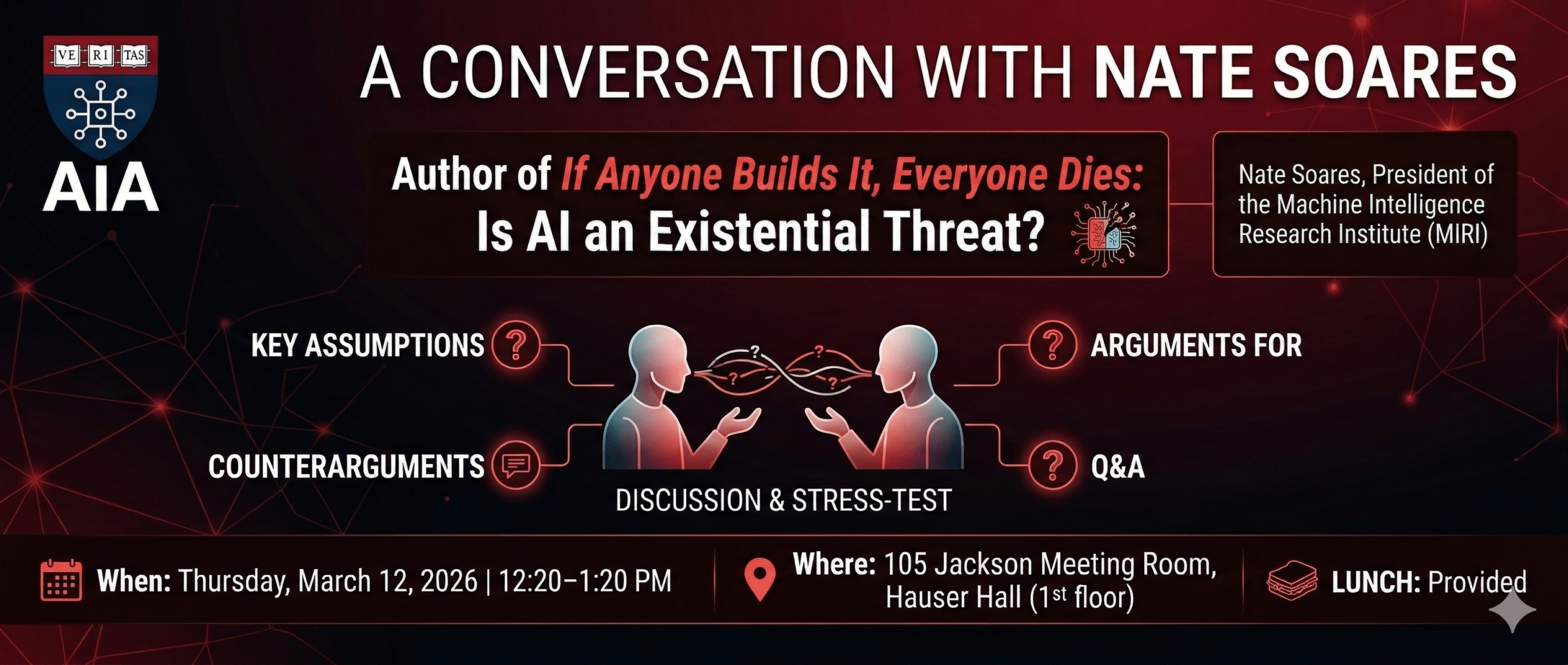 But how compelling is the argument? In this moderated discussion, Soares will lay out the case for why the current trajectory of AI development poses an existential threat — and then, we’ll have an opportunity to push back. We’ll try to identify the key assumptions, surface the strongest counterarguments, raise the objections that skeptics and proponents alike are grappling with, and stress-test the reasoning in a way that goes deeper than you’d get from just reading the book. The goal is to come away with a more informed and nuanced understanding of one of the most important questions of our time.