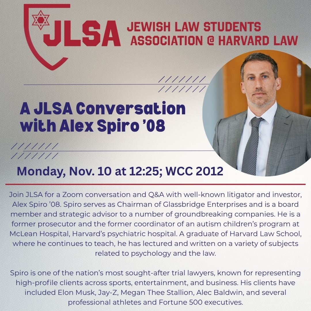 Join JLSA for a Zoom conversation and Q&A with well-known litigator and investor Alex Spiro ’08. He serves as Chairman of Glassbridge Enterprises and is a board member and strategic advisor to a number of groundbreaking companies. Mr. Spiro is a former prosecutor and the former coordinator of an autism children’s program at McLean Hospital, Harvard’s psychiatric hospital. A graduate of Harvard Law School, where he continues to teach, he has lectured and written on a variety of subjects related to psychology and the law.