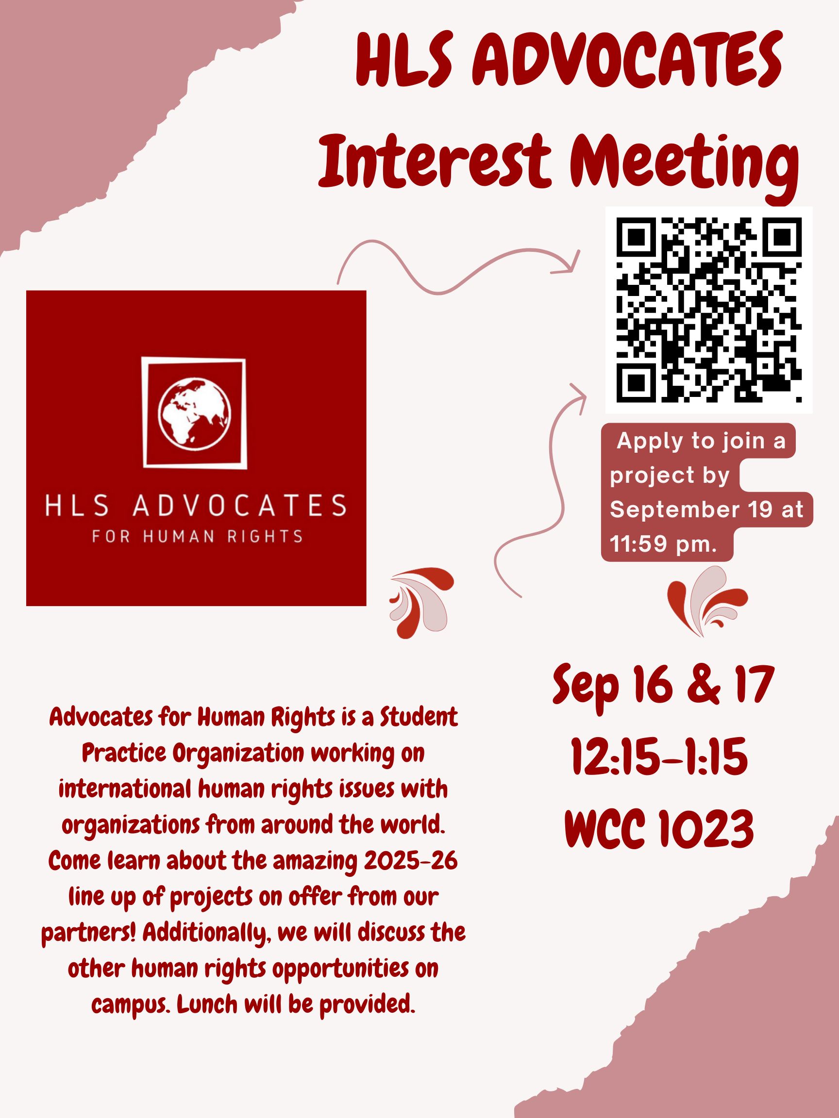 Advocates for Human Rights is a Student Practice Organization working on international human rights issues with organizations from around the world. Come learn about the amazing 2025-26 line up of projects on offer from our partners! Additionally, we will discuss the other human rights opportunities on campus. Lunch will be provided.