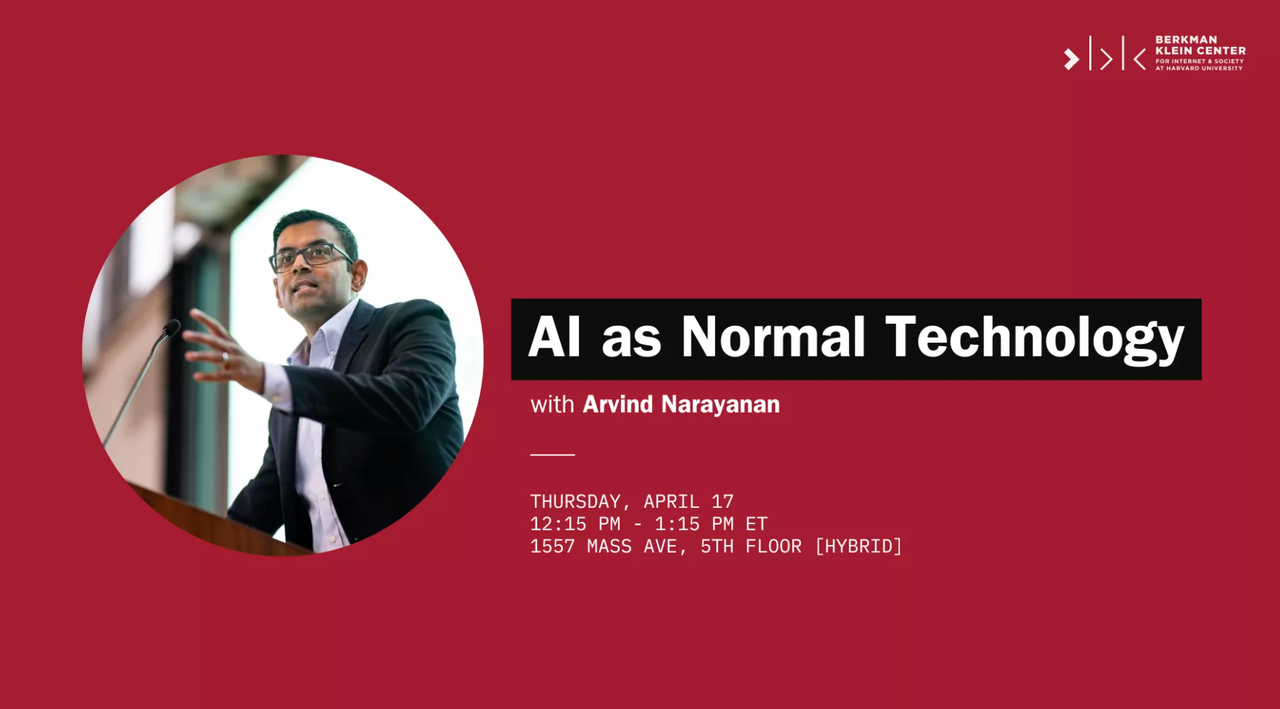 Narayanan will explain why he believes that the impacts of advanced AI, even if transformative, will unfold slowly, making a critical distinction between AI methods, AI applications, and AI adoption. He will discuss a potential division of labor between people and AI in the world with advanced AI and examine the implications of AI as normal technology for AI policy, AI safety, and human progress.