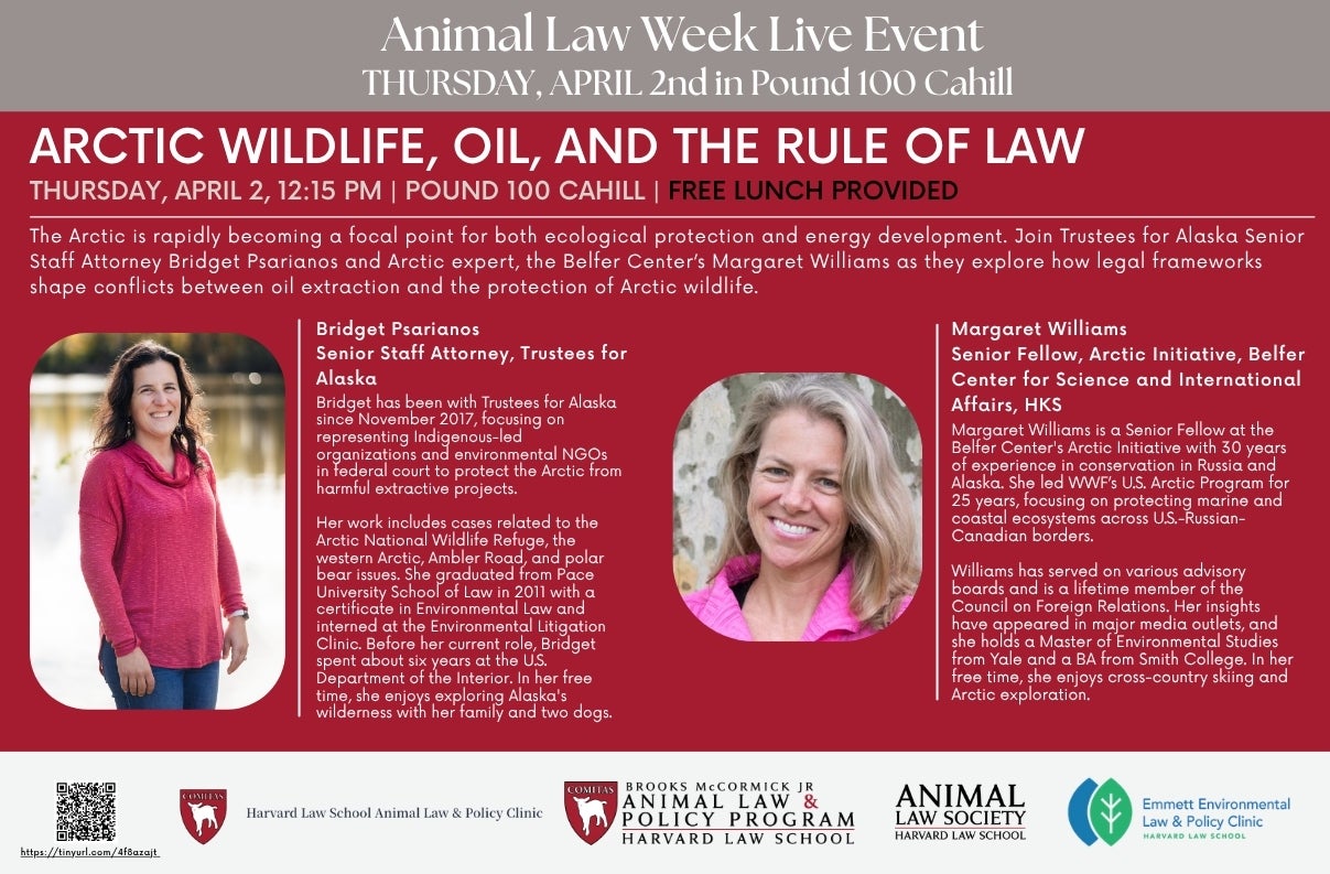 The Arctic is ground zero for the clash between energy extraction and wildlife survival. Join us for a discussion with HKS Arctic expert, Margaret Williams and Bridget Psarianos, a Senior Staff Attorney with Trustees for Alaska, litigator on the front lines of this fight. Psarianos has represented Indigenous-led organizations to protect regions like the Arctic National Wildlife Refuge, and draws on her experience within the U.S. Department of the Interior. In this conversation, our two experts will offer a unique perspective on the legal battles shaping the future of this fragile ecosystem.