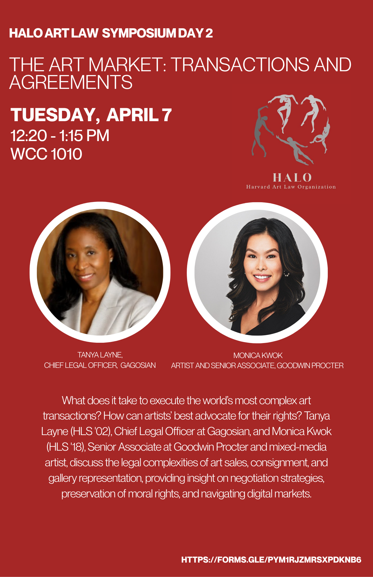 Join the Harvard Art Law Organization for a moderated panel with Tanya Layne (HLS ’02), Chief Legal Officer at Gagosian, and Monica Kwok (HLS ’18), Senior Associate at Goodwin Procter and mixed-media artist.