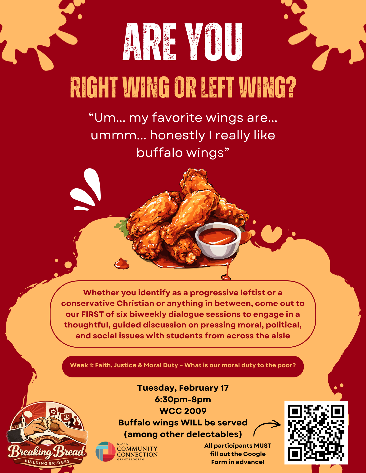 Whether you identify as a progressive leftist or a conservative Christian or anything in between, join Breaking Bread, Building Bridges—a student-led initiative funded by the Dean’s Community Connection Grant and the President’s Building Bridges Fund—for the FIRST of six biweekly dialogue sessions to engage in a thoughtful, guided discussion on pressing moral, political, and social issues with students from across the aisle.