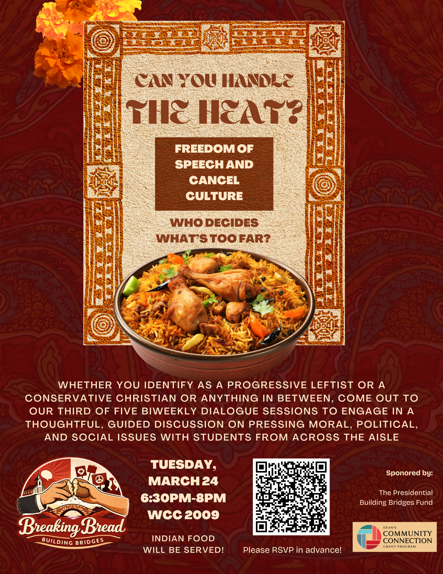 Whether you identify as a progressive leftist or a conservative Christian or anything in between, join Breaking Bread, Building Bridges—a student-led initiative funded by the Dean’s Community Connection Grant and the President’s Building Bridges Fund—for the third of five biweekly dialogue sessions to engage in a thoughtful, guided discussion on pressing moral, political, and social issues with students from across the aisle. This week’s session will explore freedom of speech and cancel culture – Who decides what’s too far? Indian food will be served.