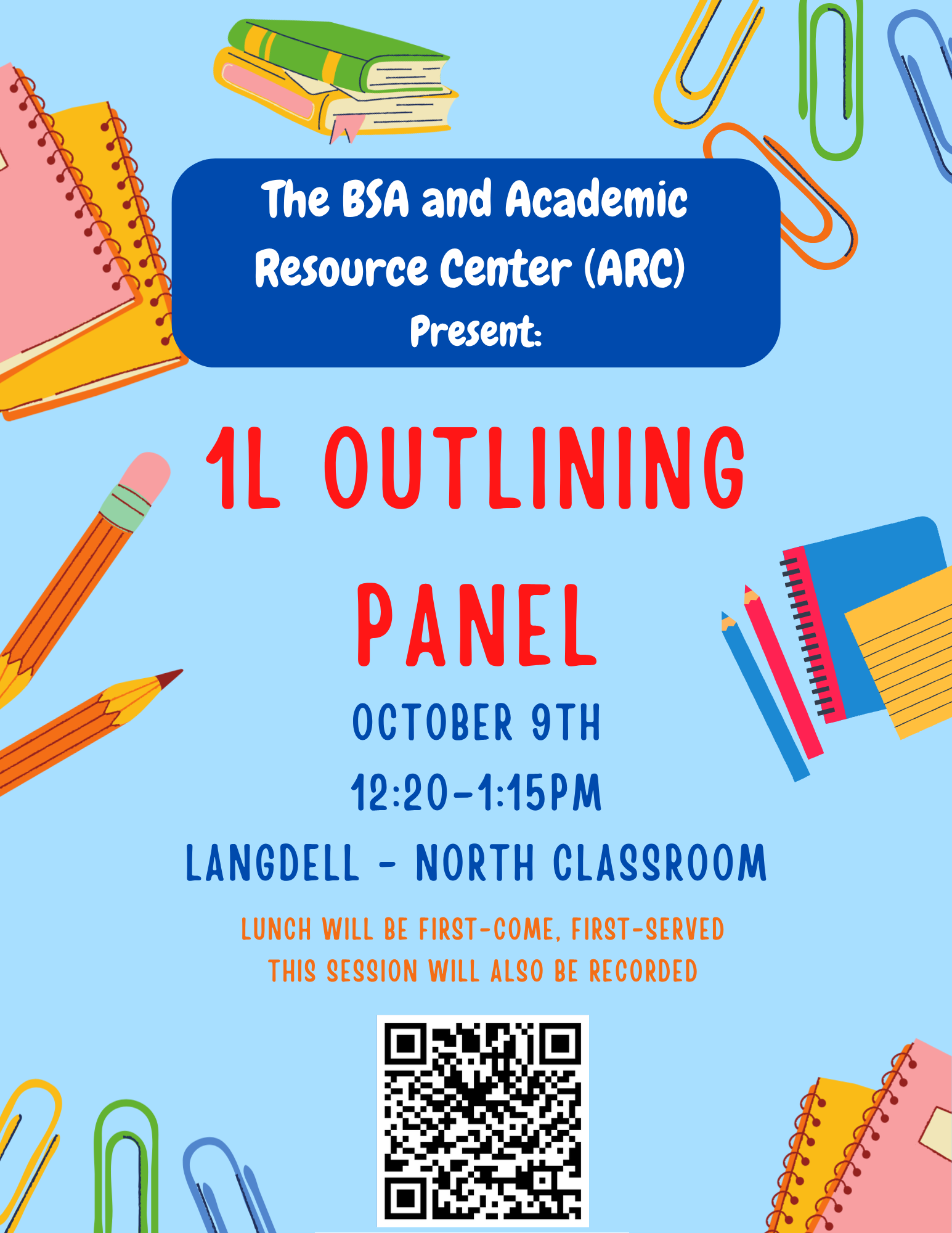Please join the BSA and Harvard’s Academic Resource Center for a panel on all things outlining. Attendees will hear from BSAs who explain what outlines are, how they go about the outlining process, how to find good outlines, and how outlining fits into their overall exam preparation. This event will take place on Thursday, October 9th, in Langdell North from 12:20-1:15 PM.