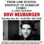 Join the Jewish Law Students Association on Thursday, November 20, at 12:30 PM in WCC 3018 for “From Law School Dropout to Stand-Up Comic: A Lunch Talk with Dovi Neuburger.” Dovi Neuburger is a recovering law student and New York City–based stand-up comedian. After attending NYU School of Law for one semester, he chose to […]