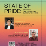 Come join QTPOC and Lambda for Trans Day of Visibility to hear from Deborah Lolai and Alex Sacks-West regarding their experiences as trans clinical legal instructors at HLS as well as their careers in direct legal services and public defense. This panel will be held on Friday, March 27th at WCC 3018 from 12:30pm – […]