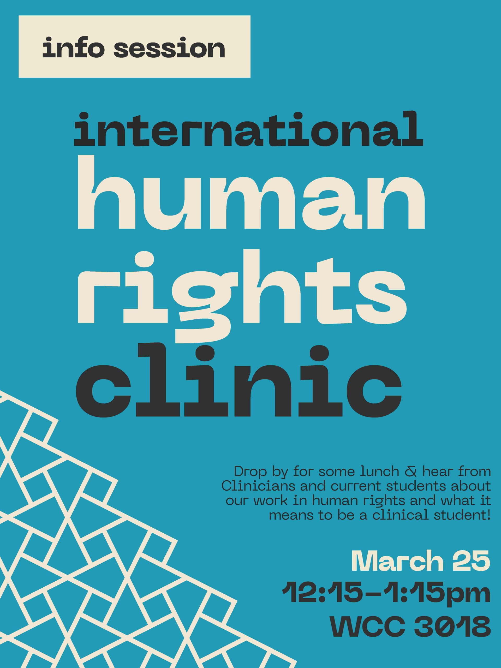 The International Human Rights Clinic invites interested students to drop by WCC 3018 for some lunch and to hear from Clinicians and current students about our work in human rights and what it means to be a clinical student!