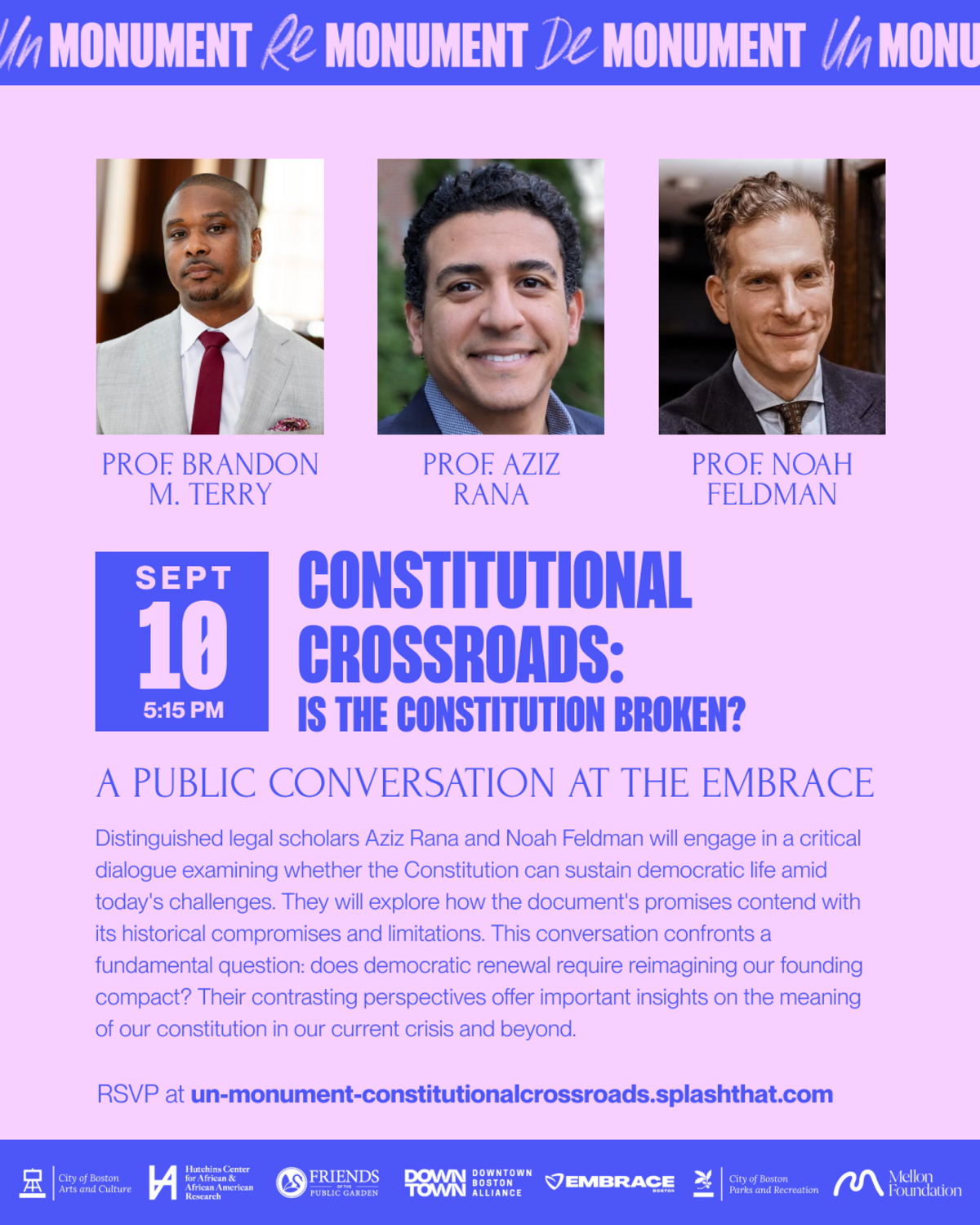 On September 10 at 5:15pm, distinguished legal scholars Aziz Rana and Noah Feldman will engage in a critical dialogue examining whether the Constitution can sustain democratic life amid today’s challenges. They will explore how the document’s promises contend with its historical compromises and limitations. This conversation confronts a fundamental question: does democratic renewal require reimagining our founding compact? Their contrasting perspectives offer important insights on the meaning of our constitution in our current crisis and beyond.