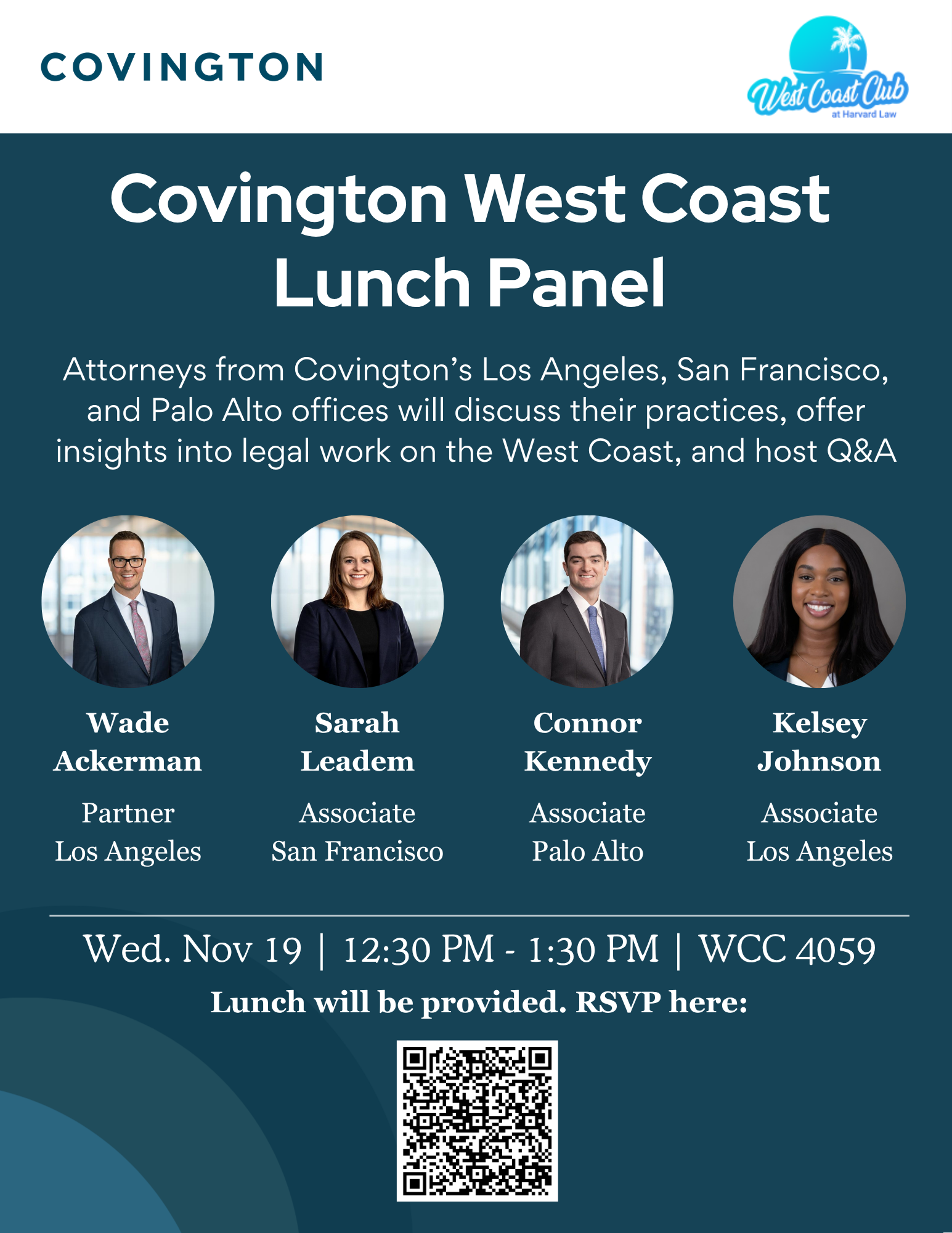 Attorneys from Covington’s Los Angeles, San Francisco, and Palo Alto offices will discuss their practices, offer insights into legal work on the West Coast, and host Q&A. Lunch will be provided. Please RSVP here: https://docs.google.com/forms/d/e/1FAIpQLSeyinsQVQ4VcXFDT7_Q86IMIHXD8Zh9SX11zXzJv0DseC1bwA/viewform?usp=dialog