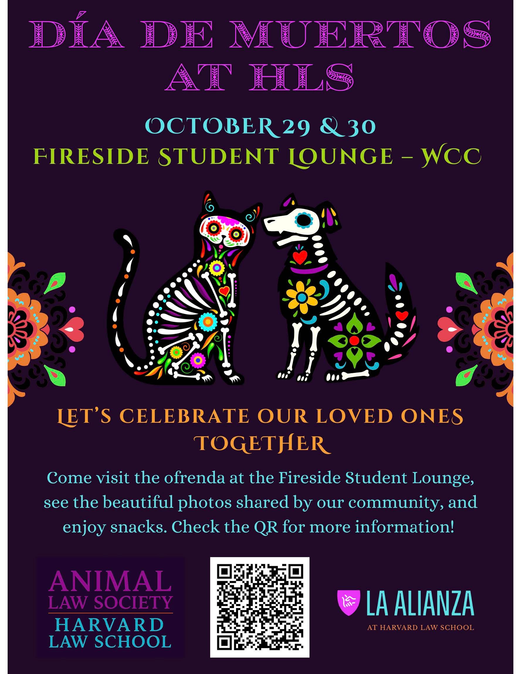 Día de Muertos (Day of the Dead) is a Mexican tradition that honors the memory of our loved ones who have passed away. Families and communities create an ofrenda, or altar, decorated with flowers, candles, pictures, and favorite foods of those who are no longer with us. It is a way to celebrate their lives, share stories, and keep their memory alive through love and joy. This year, the Harvard Animal Law Society and Alianza invite the HLS community to join us in creating a collective ofrenda.