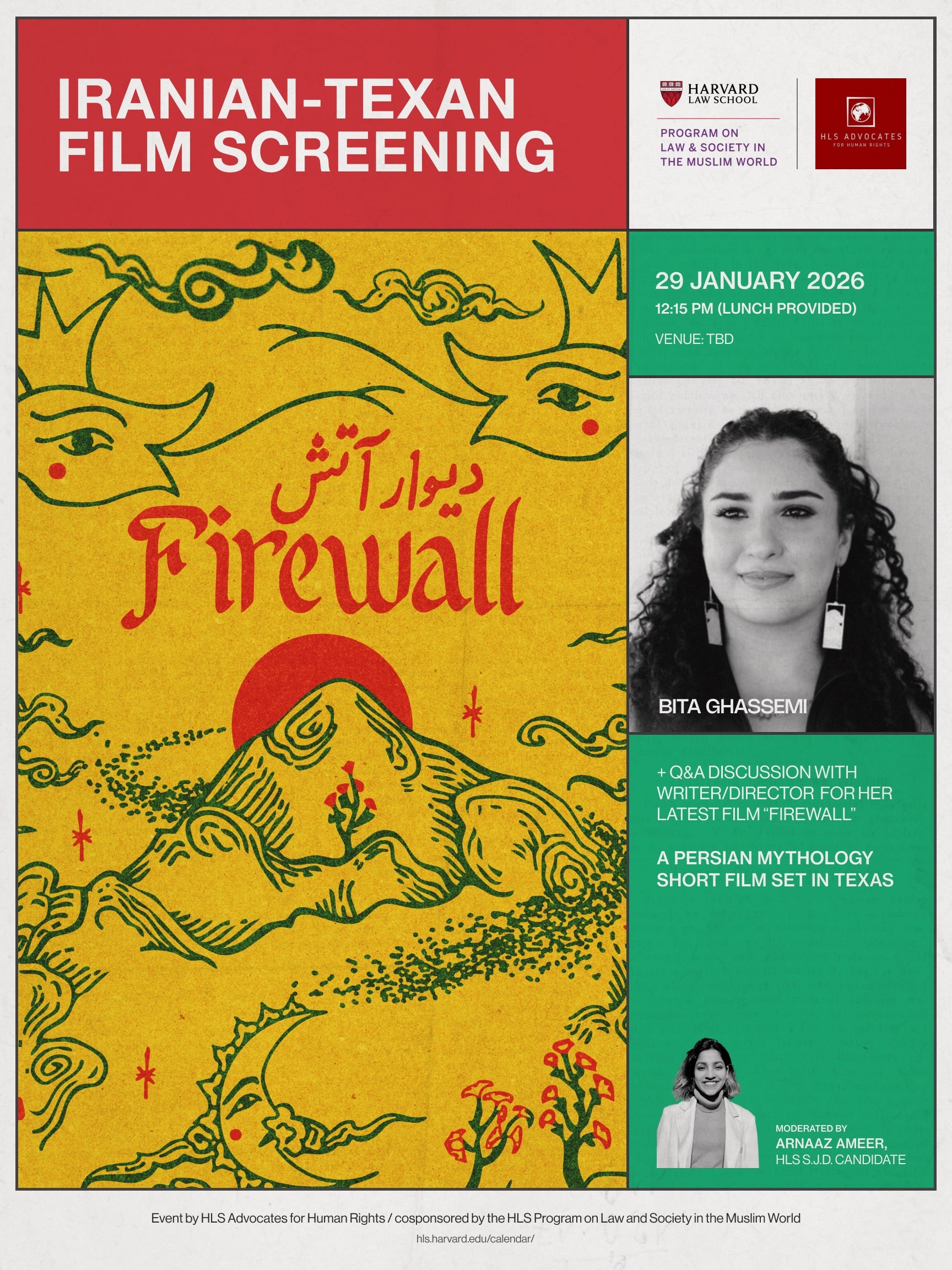 Please join HLS Advocates for Human Rights and the Program on Law and Society in the Muslim World for a special screening of Firewall, a short film written and directed by Iranian-Texan filmmaker Bita Ghassemi.
