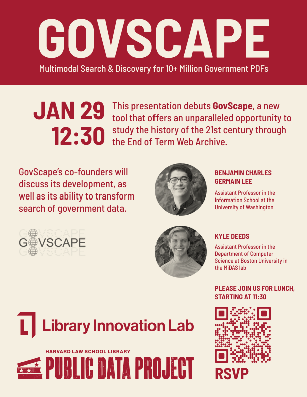 Please join Kyle Deeds and Benjamin Lee as they share the debut of GovScape, a new tool that offers an unparalleled opportunity to study the history of the 21st century through the End of Term Web Archive. GovScape’s co-founders will discuss its development, as well as its ability to transform search of government data.