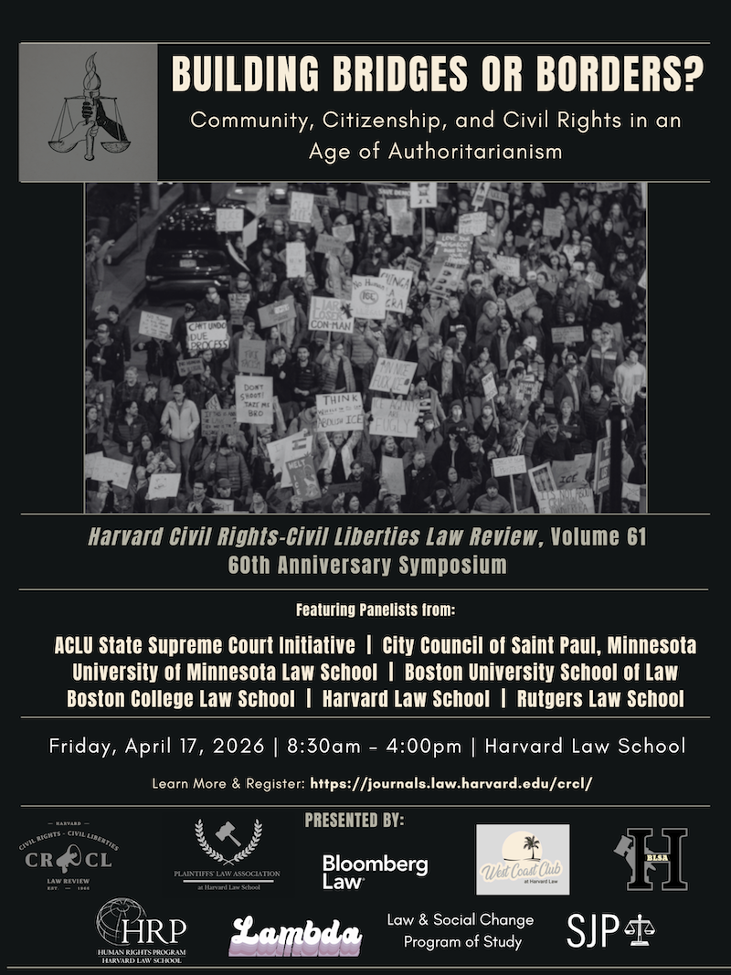 On Friday, April 17, 2026, Harvard CR-CL will honor our founding members’ vision by hosting a 60th Anniversary Symposium. Our theme—Building Bridges or Borders? Community, Citizenship, and Civil Rights in an Age of Authoritarianism— responds to the state’s rapidly accelerating violations of the civil rights and civil liberties of non-citizens and U.S. citizens alike. Our speakers will explore these dimensions through the lens of immigration law enforcement. They hail from the ACLU State Supreme Court Initiative; the City Council of Saint Paul, Minnesota; the University of Minnesota Law School; Boston University School of Law; Boston College Law School; Harvard Law School; and Rutgers Law School.