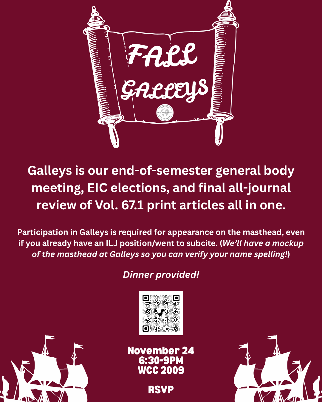 Galleys is our end-of-semester general body meeting, EIC elections, and final all-journal review of Vol. 67.1 print articles, all in one. Galleys will run from 6:30 pm to about 9 p.m., and dinner is provided!
