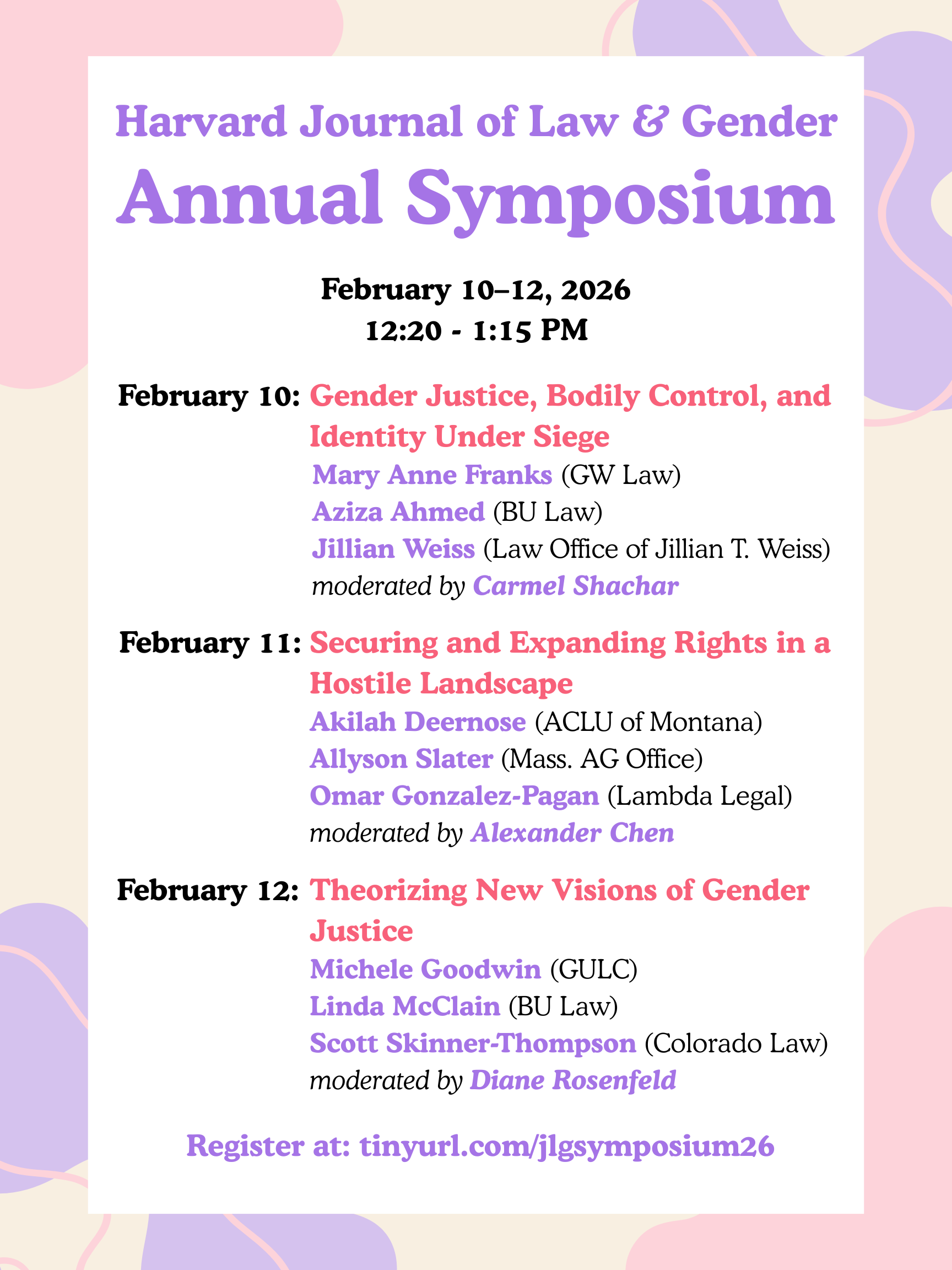 The Journal of Law and Gender Annual Symposium will occur February 10-12, 2026 from 12:20pm to 1:15pm each day. It will feature over leading scholars, practitioners, and advocates over the course of three panels. This year, the Symposium aims to chart the progression of gender and the law over time through three panels: (1) Gender Justice, Bodily Control, and Identity Under Siege, (2) Securing and Expanding Rights in a Hostile Landscape, and (3) Theorizing New Visions of Gender Justice. For a full list of speakers, please visit our website. Please register here; lunch will be provided for registrants. Room locations will be announced at end of January.