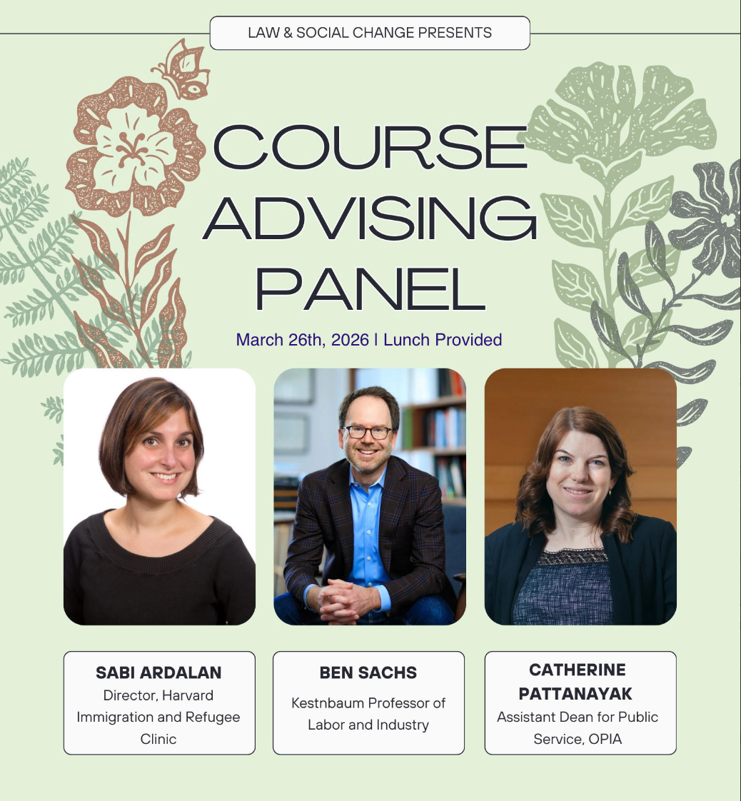 Course registration is fast approaching! Whether you are a 1L who has to decide their full schedule for the first time, or a 2L interested in making the most of their last year, we could all use some tips on what classes to take. Join Professor Ben Sachs, Clinical Professor Sabi Ardalan, and Assistant Dean Catherine Pattanayak and the Law & Social Change Program for a session on Course Advising. Lunch provided!
