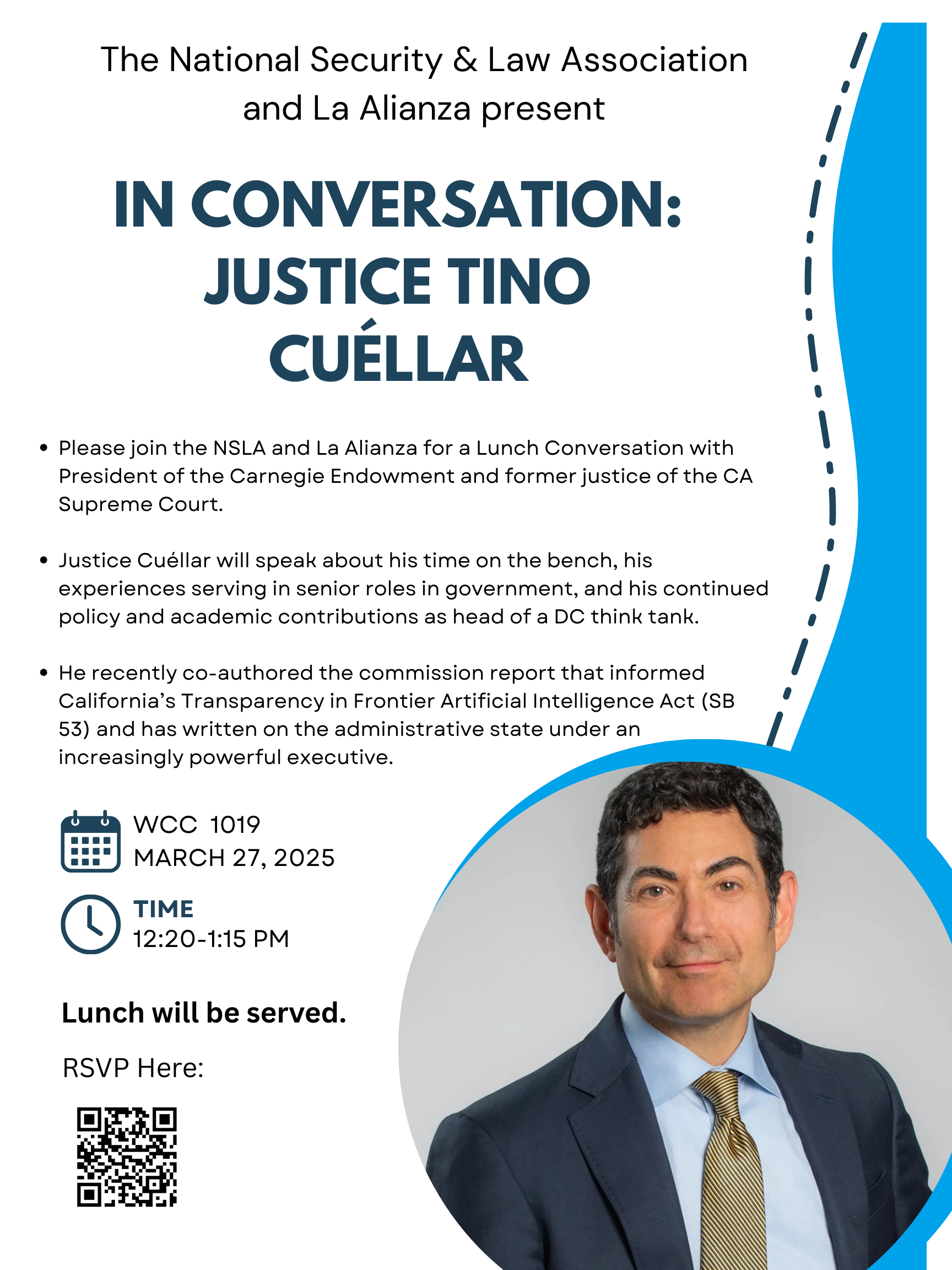 Join the National Security & Law Association, La Alianza, and the International Law Journal for a lunch talk with Tino Cuéllar, president of the Carnegie Endowment and former justice of the CA Supreme Court.