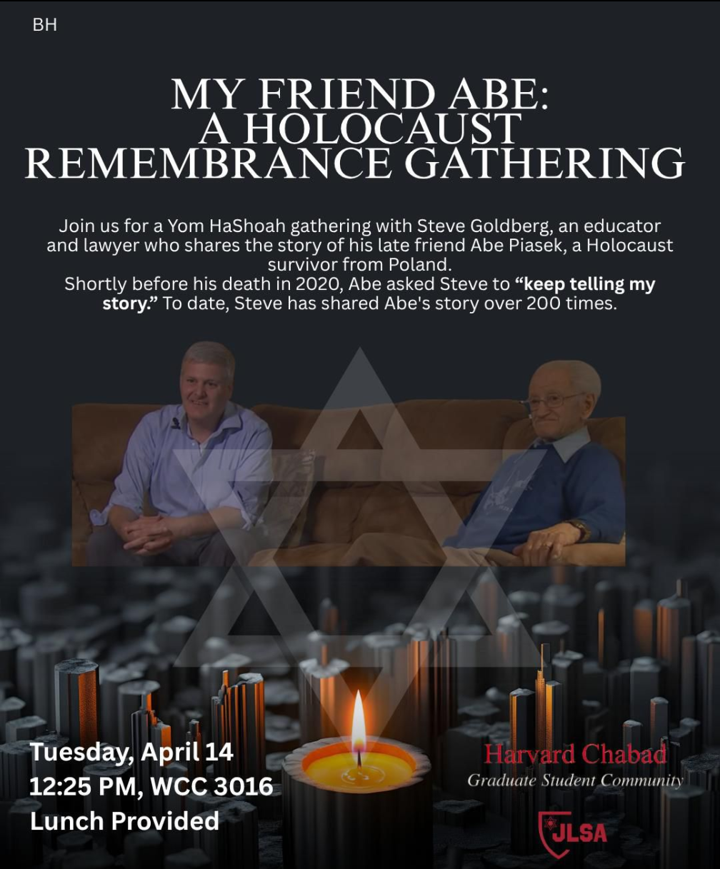 Join us for a Yom HaShoah gathering with Steve Goldberg, an educator and lawyer who shares the story of his late friend Abe Piasek, a Holocaust survivor from Poland.