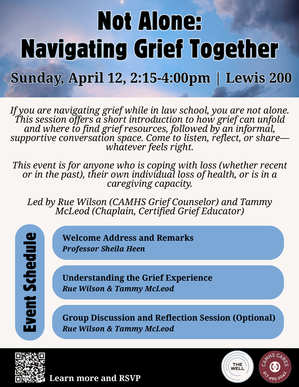 If you are navigating grief while in law school, you are not alone. This session offers a short introduction to how grief can unfold, followed by an informal, supportive conversation space. Come to listen, reflect, or share—whatever feels right.