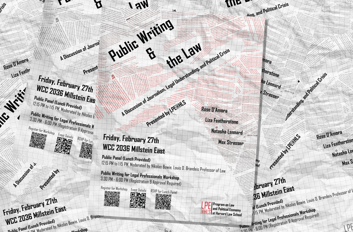 On February 27th, LPE@HLS will host Public Writing and the Law. A lunchtime panel discussion on journalism and public understanding of the law (12:15-1:15 PM) will be followed by workshops (3:30-6:00 PM, registration required) for all Boston-area law students, legal scholars, and practitioners interested in writing for a general audience. Workshops will be lead by panelists, Rose D’Amora (managing editor, The Nation), Liza Featherstone (columnist at Jacobin and The New Republic and author of Divining Desire: Focus Groups and the Culture of Consultation), Natasha Lennard (journalist and author of Being Numerous: Essays on Non-Fascist Existence), and Max Strasser (editor, The New York Times).