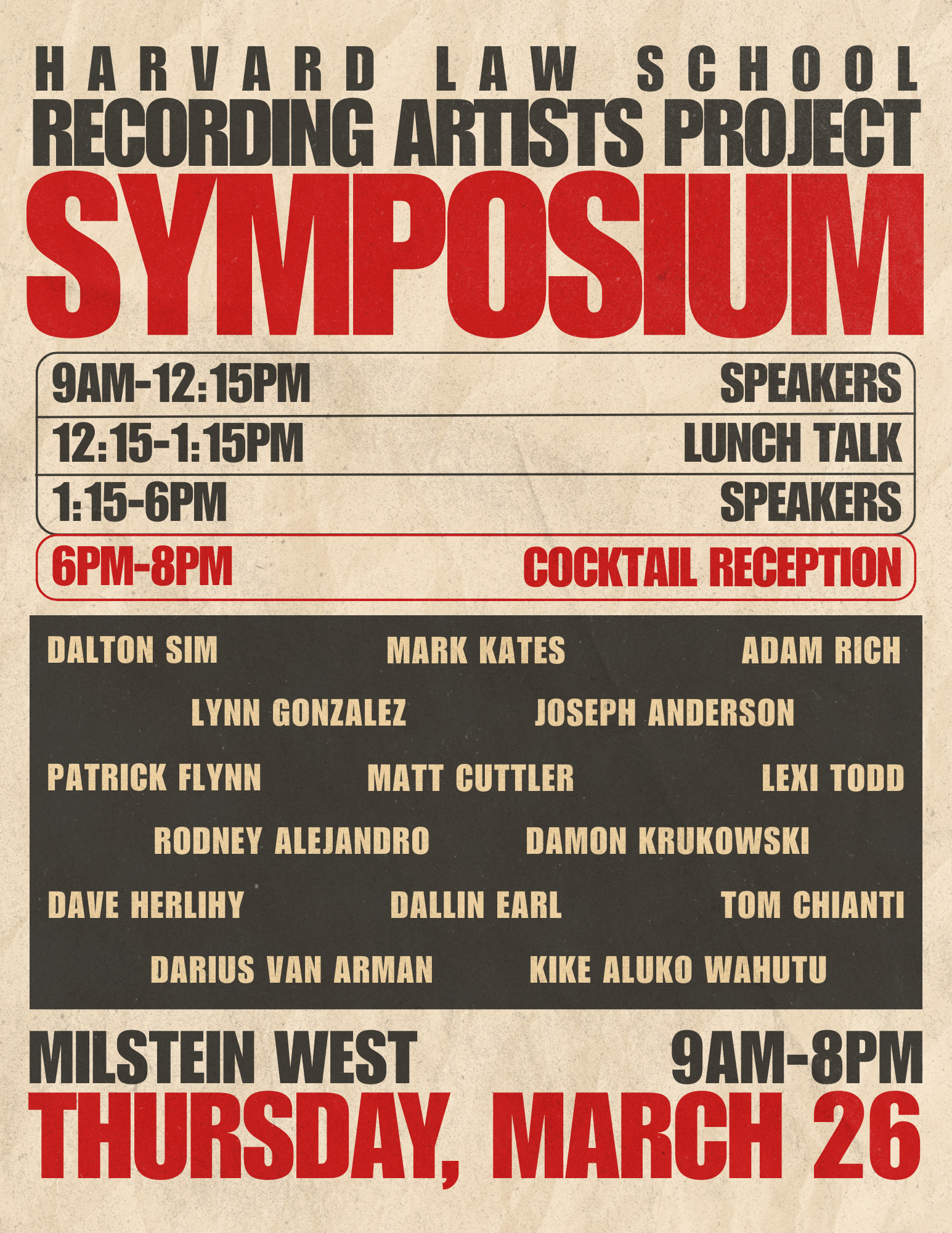 Please join the Harvard Law School Recording Artists Project for our 2026 Symposium, an all-day event full of speakers at the intersection of music, entertainment, and law: musicians, entertainment/music lawyers, managers, and record label founders.