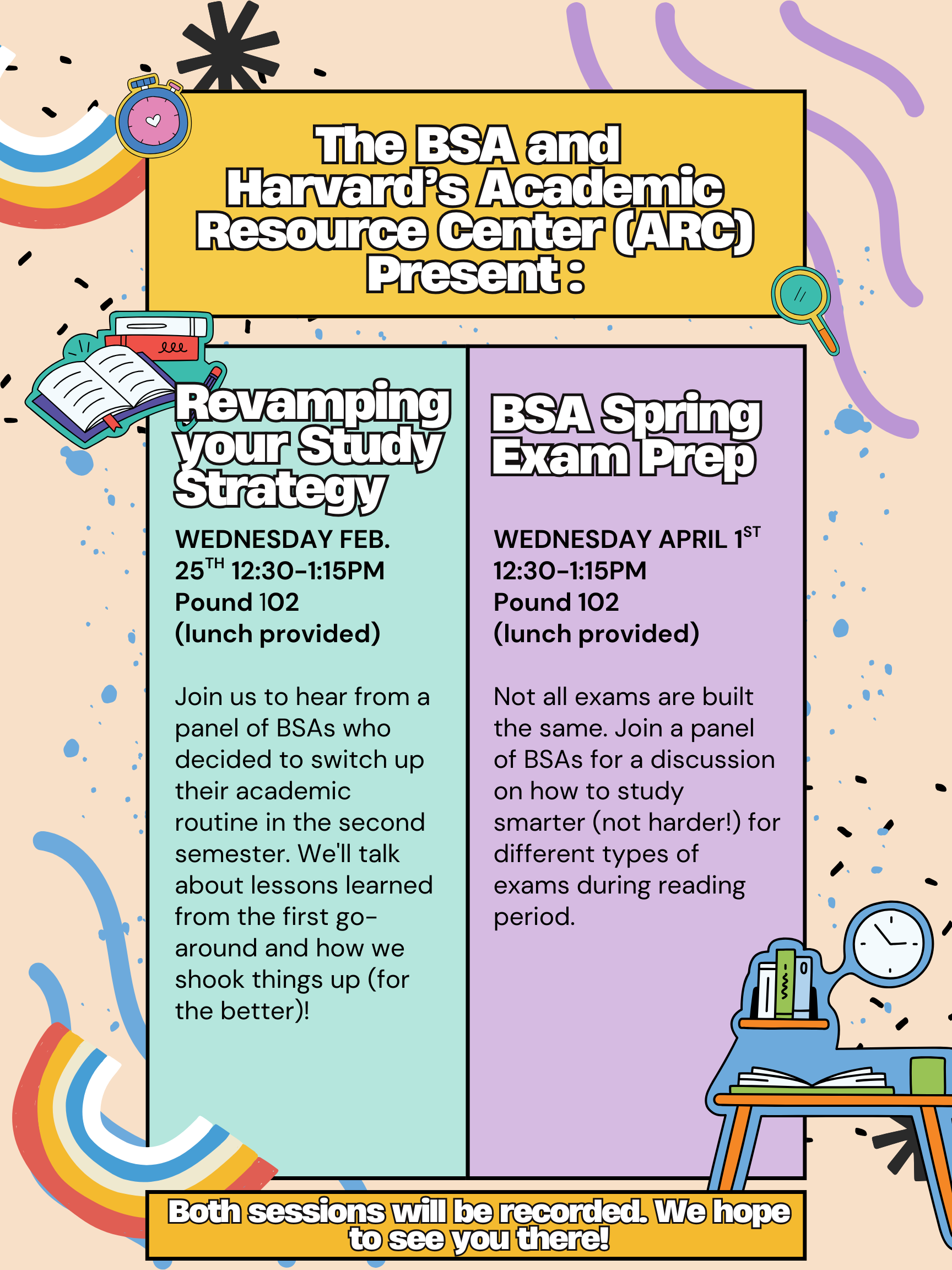 Join the BSA and Harvard’s Academic Resource Center (ARC) to hear from a panel of BSAs who decided to switch up their academic routine in the second semester. We’ll talk about lessons learned from the first go-around and how we shook things up (for the better)! Lunch will be provided. Please RSVP here.