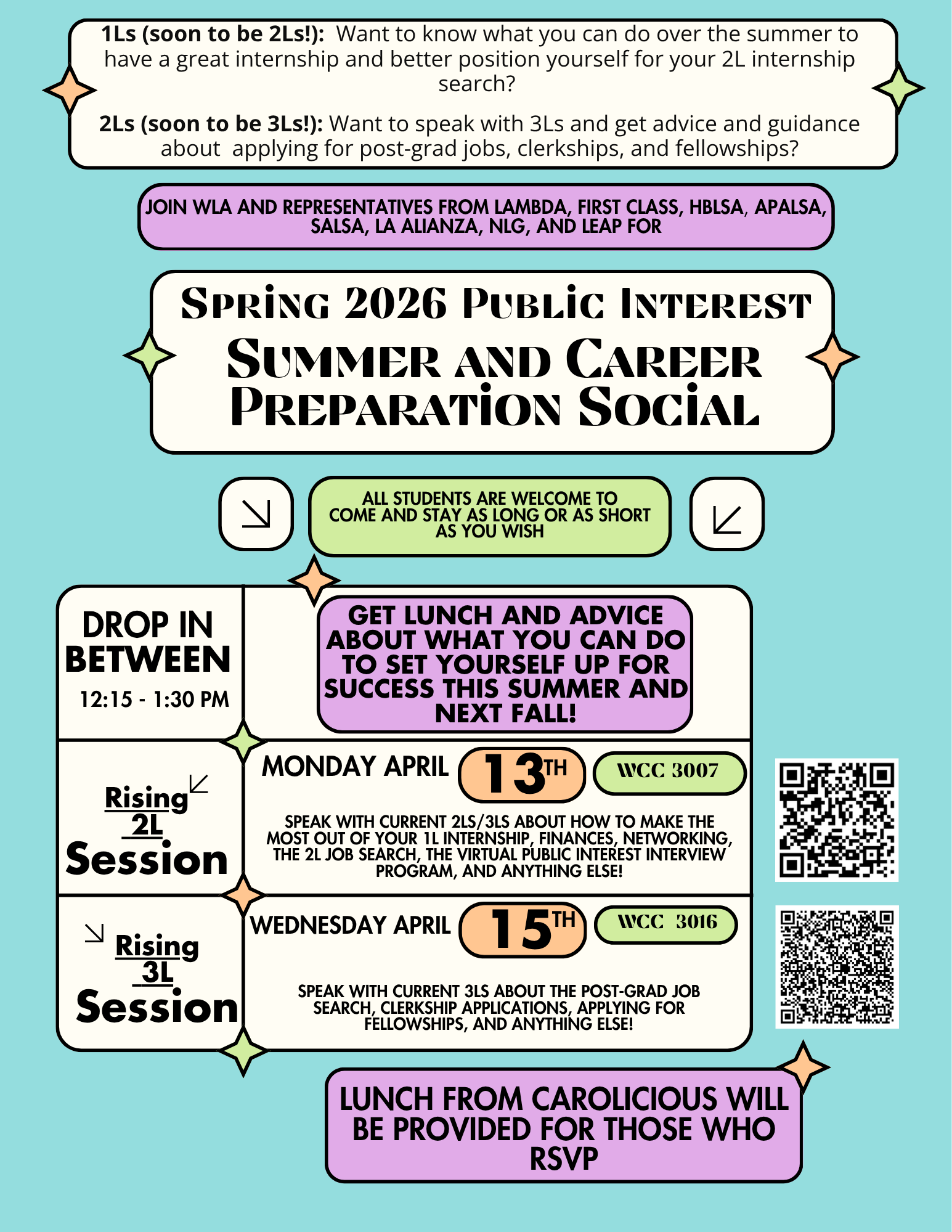 Come meet with public interest students at our public interest summer and career preparation social drop in! Come hang out, eat lunch, and get advice about what you can do to set yourself up for success.