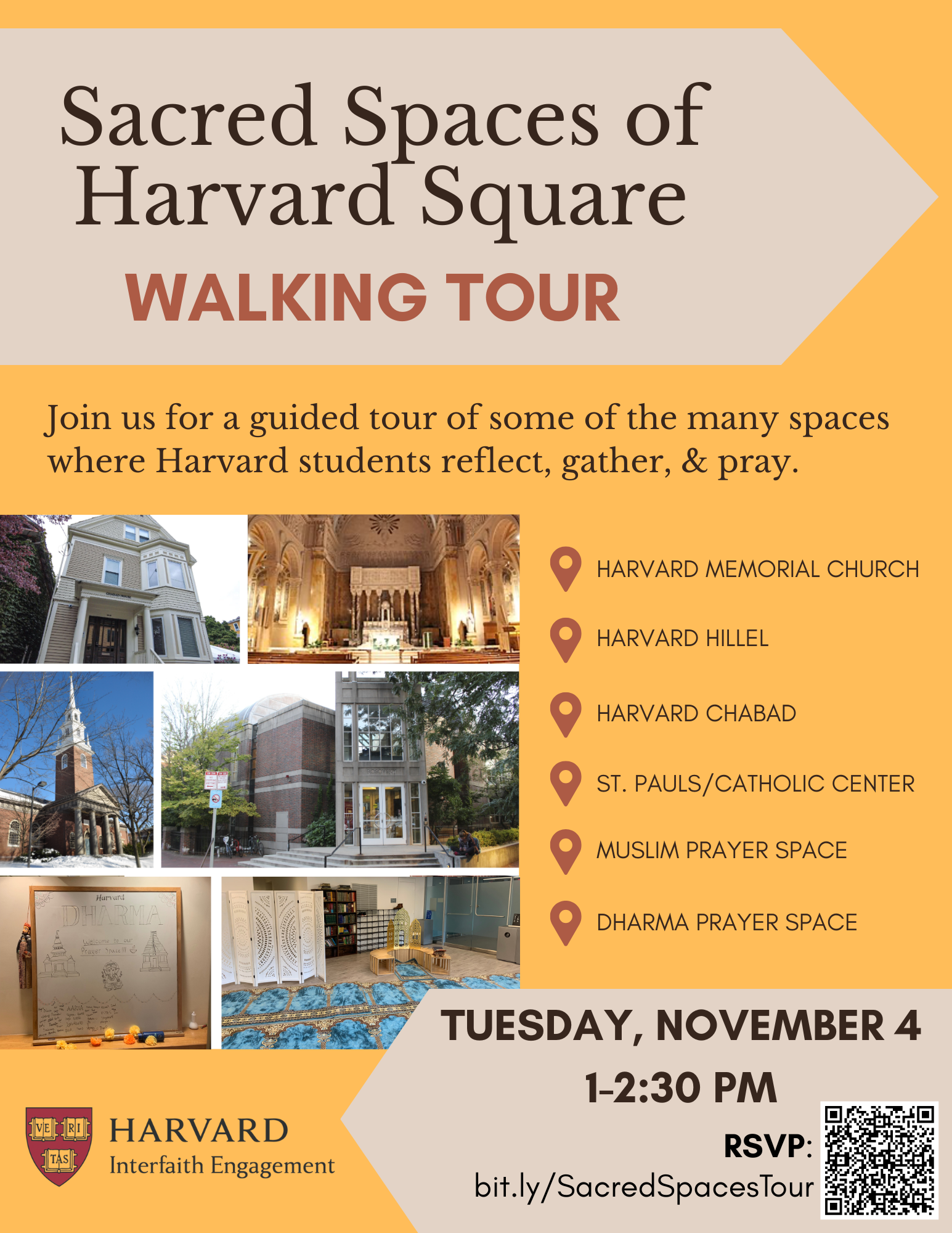 Join the Presidential Initiative on Interfaith Engagement for a walking tour of some of the many spaces where Harvard students reflect, gather, & pray. Students and staff from each community will be present to guide us through each space and answer questions. Open to all current Harvard students, faculty, and staff.