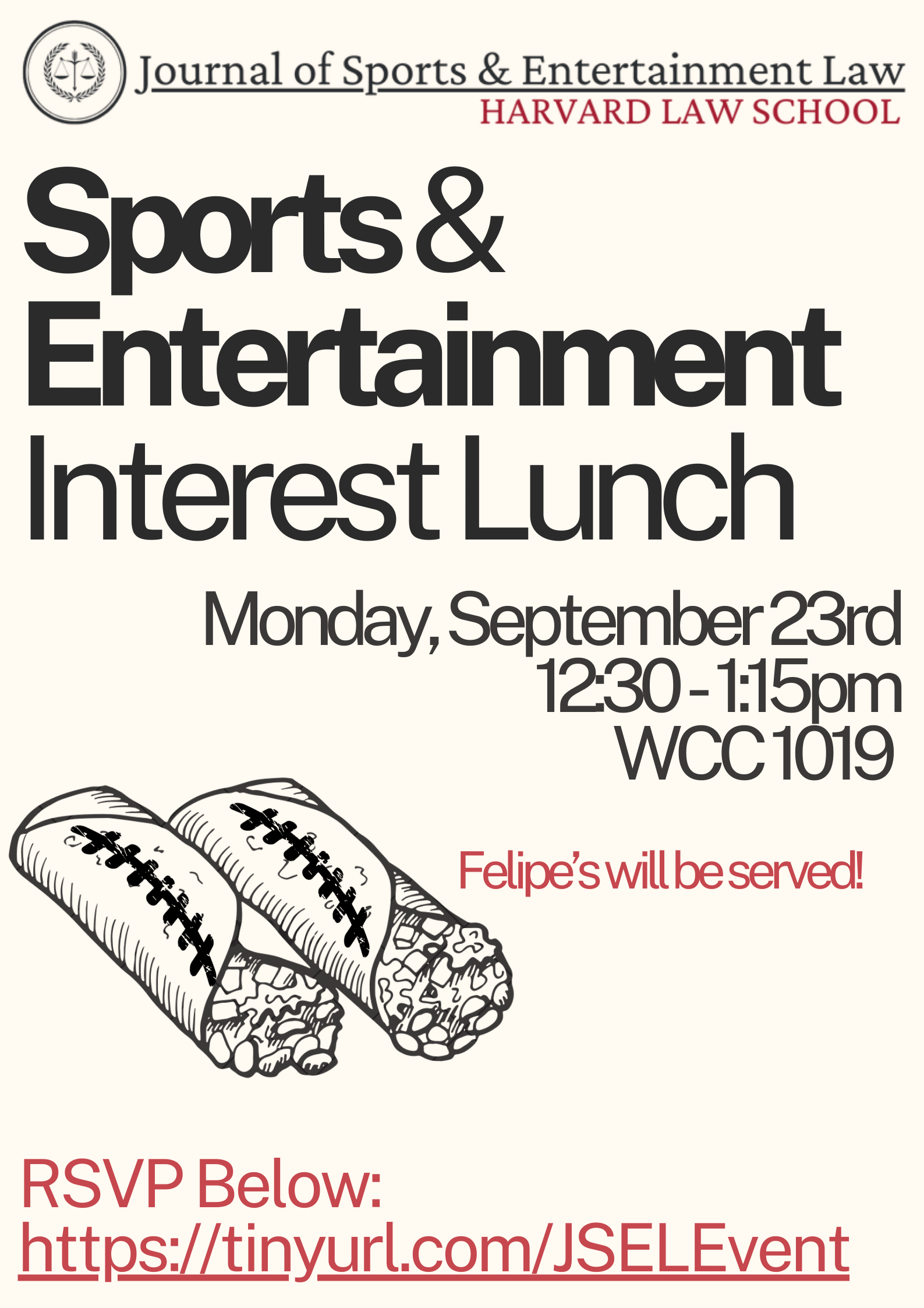 Join us for a Sports & Entertainment Interest Lunch on Monday, September 23rd in WCC 1019. Stop by for Felipe’s and to connect with the JSEL community!