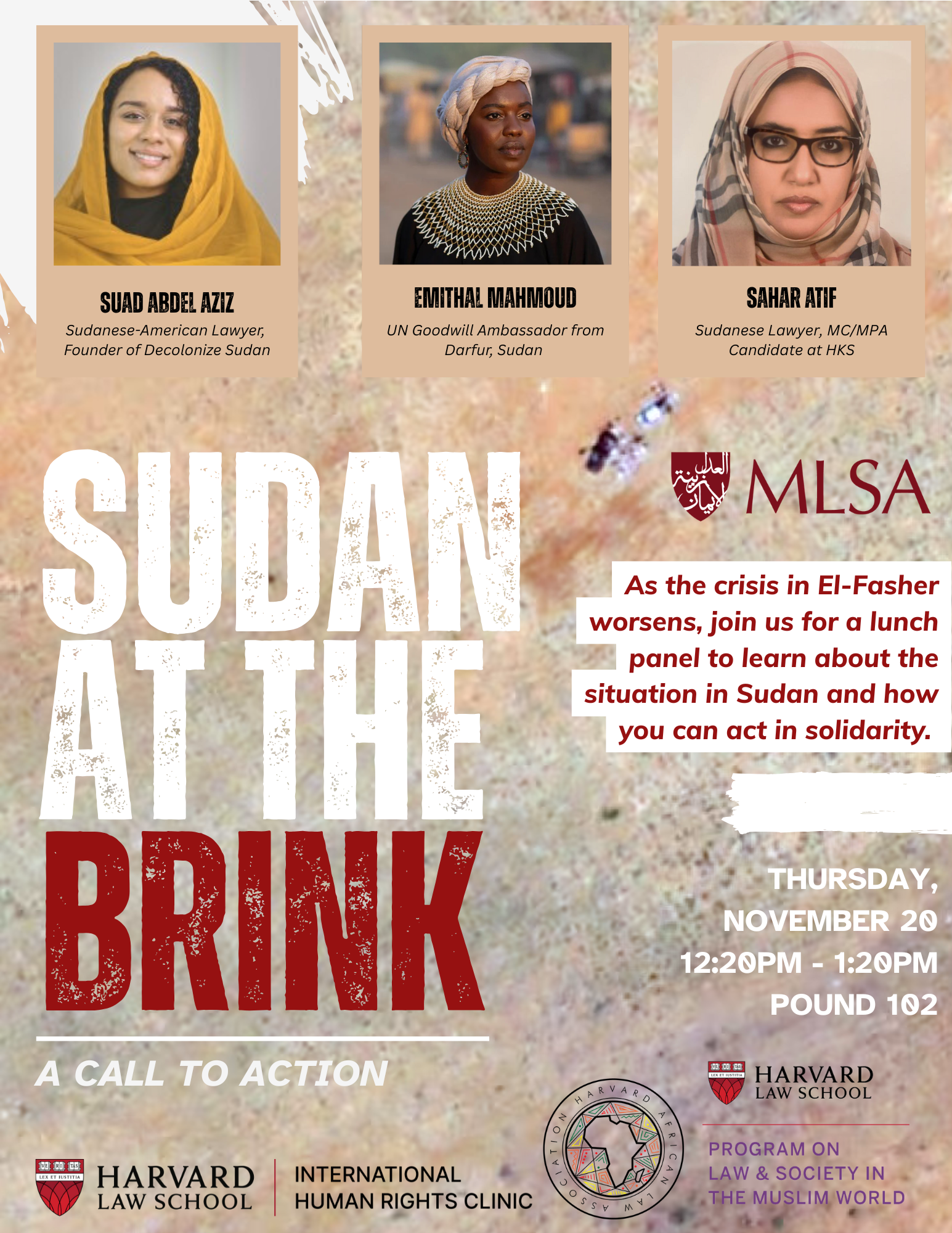 As the crisis in El-Fasher worsens, join us for a lunch panel to learn about the situation in Sudan and how you can act in solidarity. Hear from our panelists: Suad Abdel aziz, a Sudanese-American lawyer and founder of Decolonize Sudan; Emithal Mahmoud, Sudanese Poet, Activist, and Strategic Director of IDP Humanitarian Network; and Sahar Atif, Sudanese lawyer and Public Service Fellow at HKS.