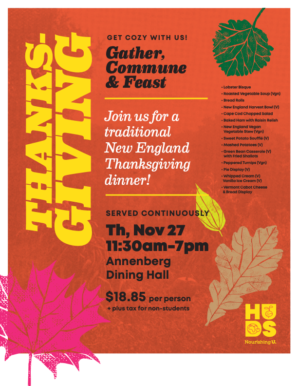 For members of our community staying on campus through the Thanksgiving break, join HUDS for a traditional New England Thanksgiving dinner, served continuously on Thursday, November 27 from 11:30am-7:00pm, at Annenberg Dining Hall. $18.85 per person (plus tax for non-students)