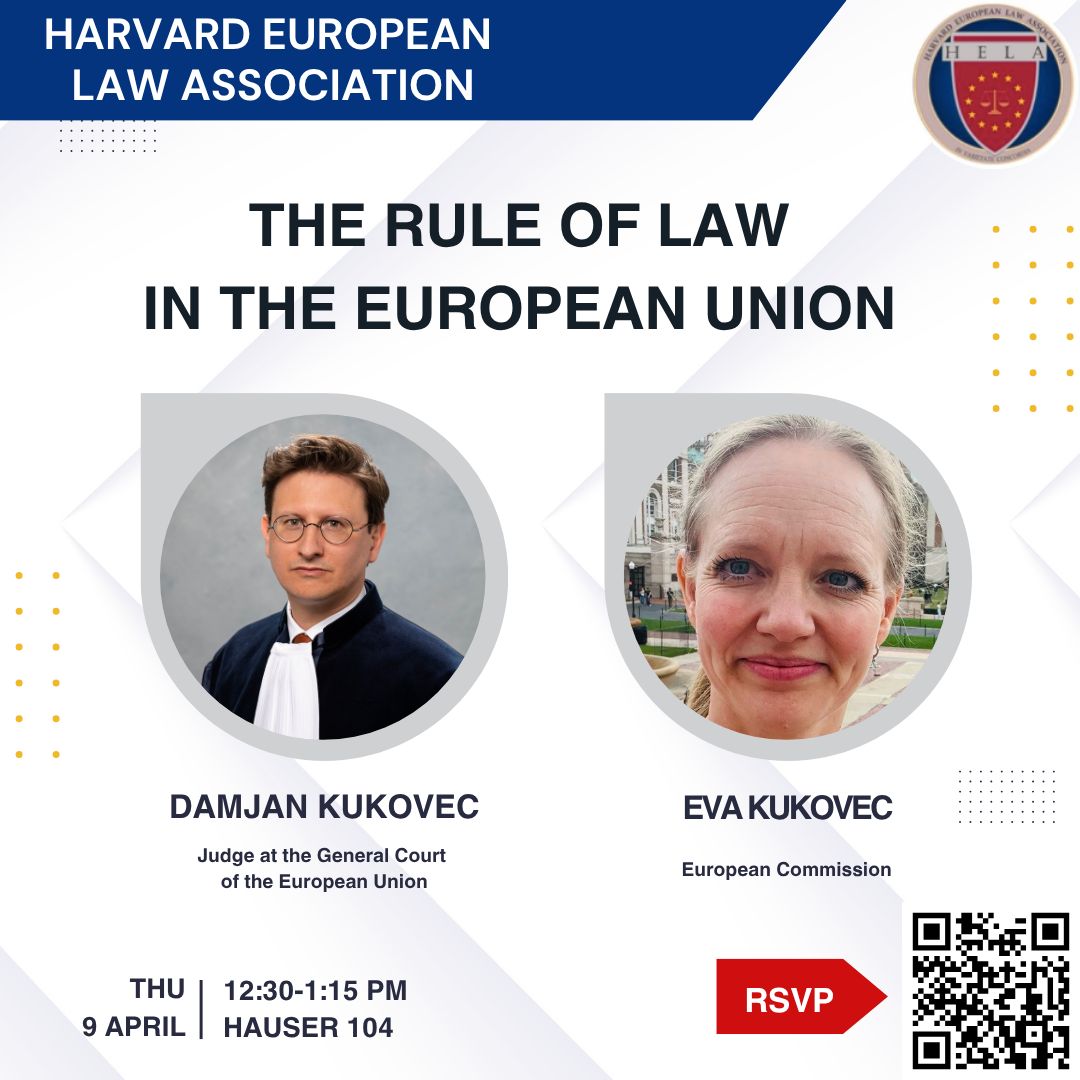 The Harvard European Law Association is pleased to host a lunch talk on Thursday, April 9, from 12:30 to 1:15 p.m. in Hauser 104 – Lumbard Classroom on “The Rule of Law in the European Union with Judge Damjan Kukovec and Eva Kukovec“.