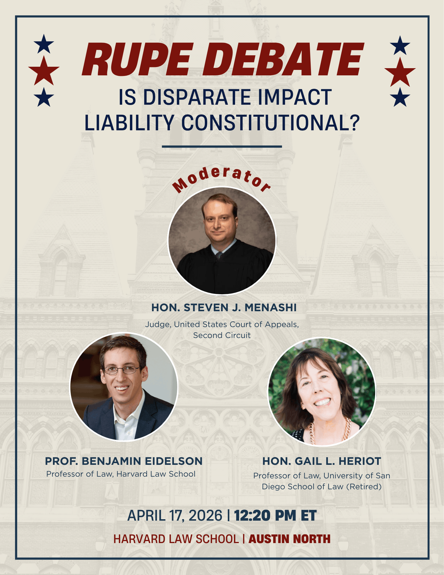 The Rupe Debate: Is Disparate Impact Liability Constitutional, with Prof. Benjamin Eidelson (HLS), Prof. Gail Heriot (UCSD), and moderated by Judge Steven Menashi (CA2)