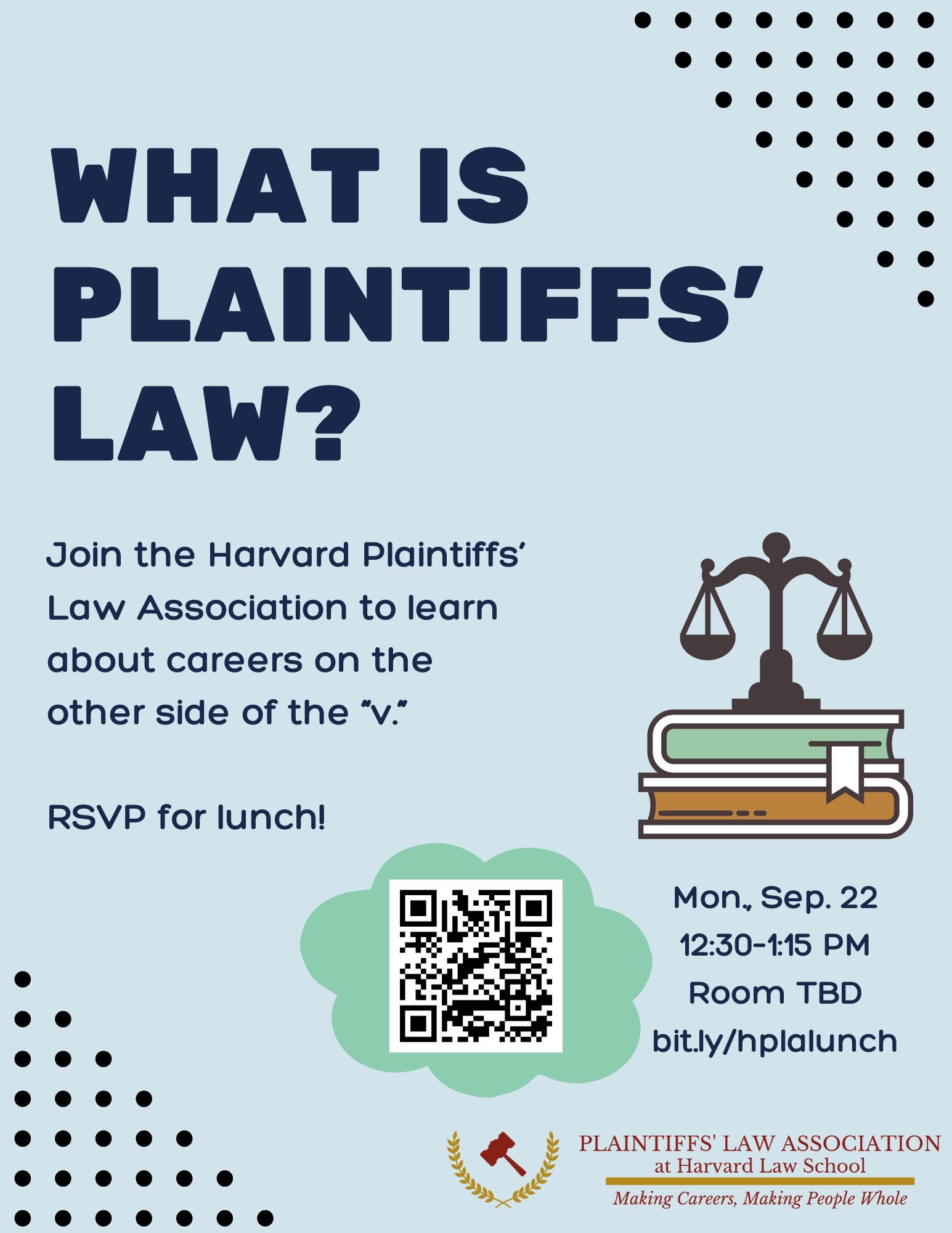 We’ll talk about plaintiff-side work (spoiler alert: it’s great) and how HPLA supports HLS students on the road to plaintiff-side litigation. Plus, we’ll be giving out some merch (first come first served). We hope to see you there! Bring your friends. RSVP here for lunch.