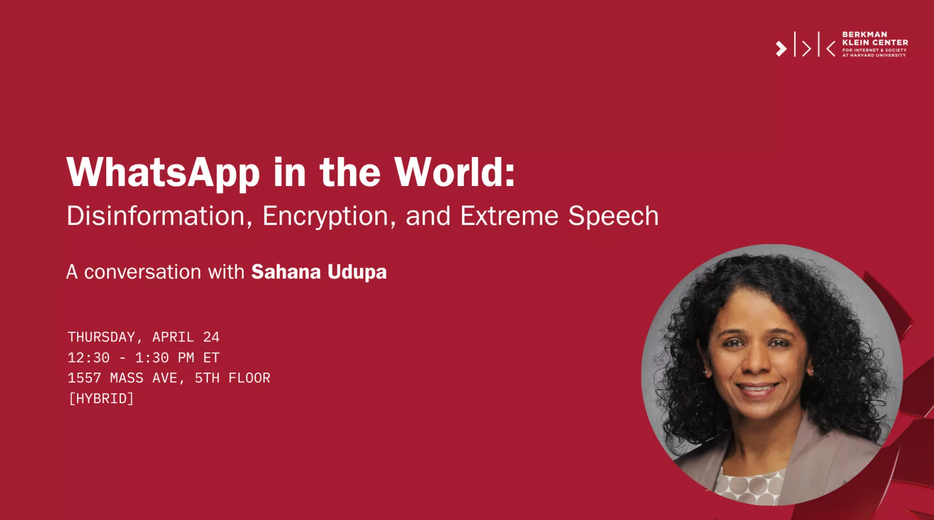 BKC is pleased to welcome Fellow and LMU professor Sahana Udupa to discuss the forthcoming edited volume WhatsApp in the World: Disinformation, Encryption and Extreme Speech with Faculty Associate and Harvard professor Gabriella Coleman.