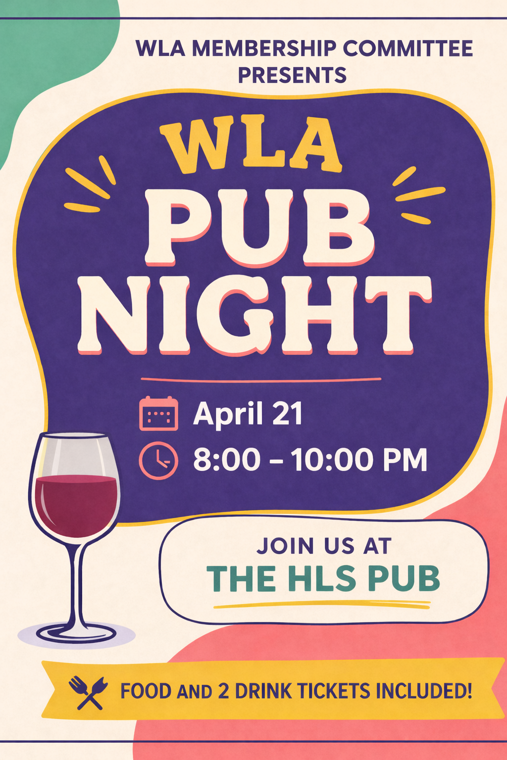 Please join the WLA Membership Committee for a Pub Night at the HLS Pub at 8pm on April 21. We’ll end the year in style, send the 1Ls and 2Ls into the summer, and say farewell to the 3Ls. Food will be provided and the first 40 attendees will receive two drink tickets!