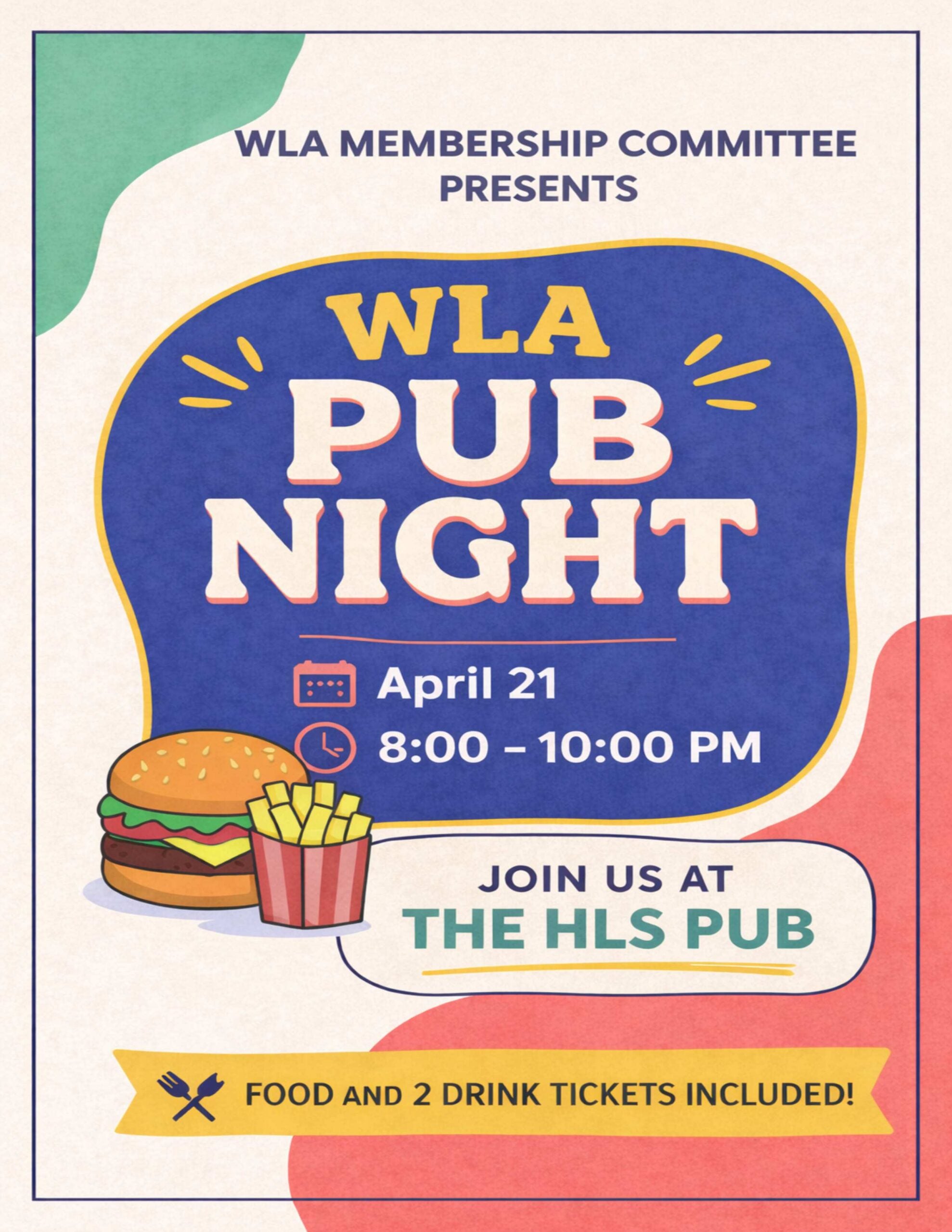 Please join the WLA Membership Committee for a fun night at the HLS Pub. We will be eating, dancing, and bidding farewell to another very successful school year. Participants will receive two drink tickets!
