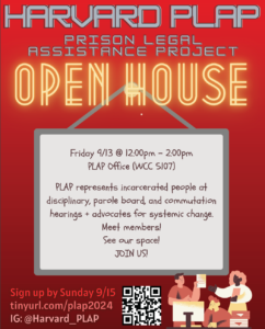 Interested in learning more about Harvard’s Prison Legal Assistance Project (PLAP)? Come eat, chat, and enjoy the last day of summer with returning members at…