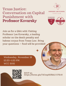 Join the Texas Club, Harvard Defenders, and the Prison Legal Assistance Project for a Q&A with Visiting Professor Lee Kovarsky, a leading scholar on the…