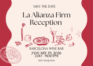 La Alianza is excited to announce that its annual Firm Reception will take place on Jan. 29, 2026, from 7:00 pm–9:00 pm at Barcelona Wine…