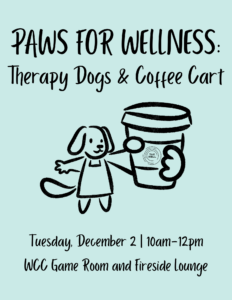 Paws for Wellness and coffee, tea, and hot cocoa from Espresso Dave’s Coffee Cart, 12/2, 10am-12pm, HLS Fireside Lounge and Game Room. Take a Paws…