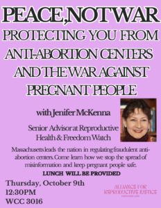 Massachusetts leads the nation in regulating fraudulent anti-abortion centers. Come learn how we stop the spread of misinformation and keep pregnant people safe in a…
