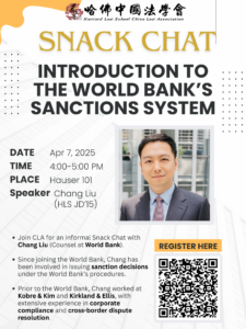 Join CLA for an informal Snack Chat with Chang Liu (link to Profile: https://www.worldbank.org/en/about/unit/sanctions-system/osd#8) from The World Bank. Chang Liu is Counsel (Sanctions) in the Office of Suspension…