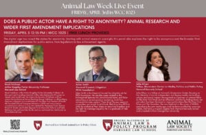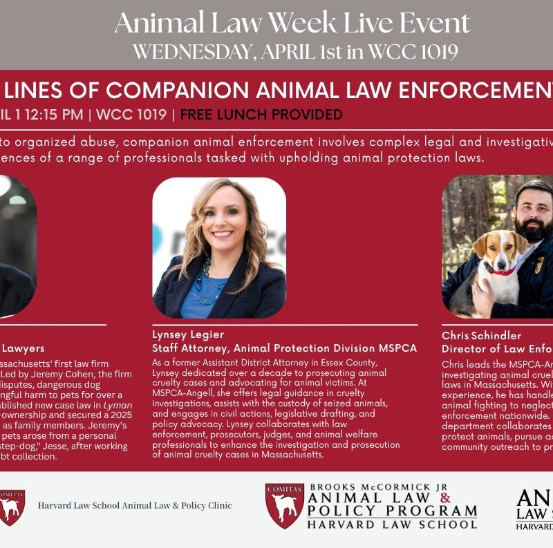 Please join the HLS Animal Law Society for a conversation with Caitlin Hawkes (Chief Program Officer, ALDF), Melissa Alpert (HLS ’17, Staff Attorney Humane World…