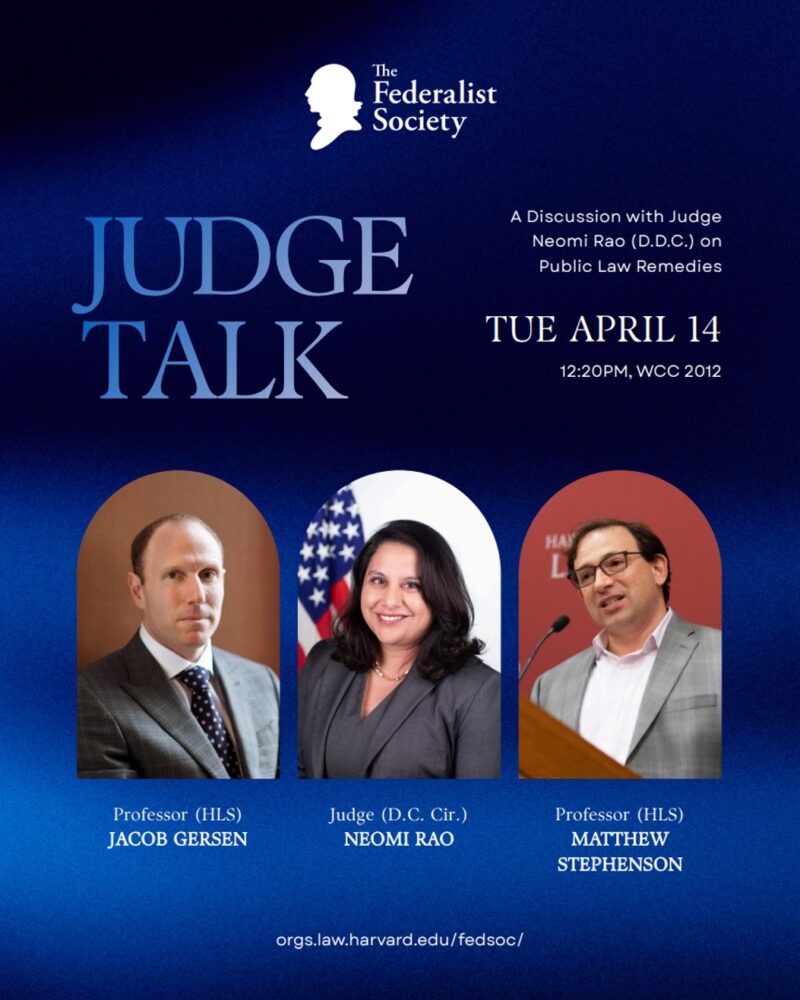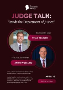 Please join the Harvard Federalist Society as we host Judge Chad Readler (CA6) and Andrew Lelling, both veterans of the Department of Justice, for an…