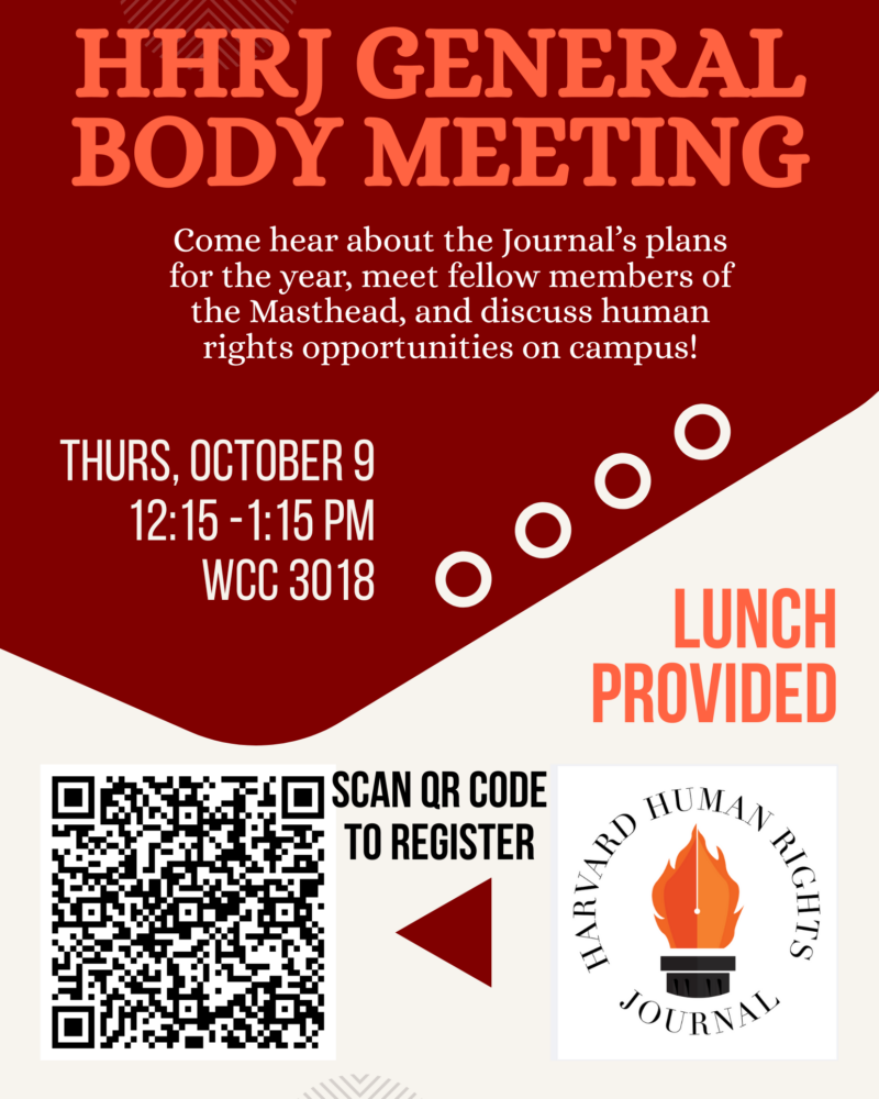 Join HHRJ for its Spring General Body Meeting with swag (for masthead members) and a talk by Uyghur lawyer, advocate, and current HLS LLM Rayhan Asat!…