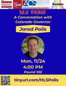 Join HLS Dems, Lambda, and EDP for a conversation between Professor Nikolas Bowie and Colorado Governor Jared Polis! Cookies from Mike’s Pastry will be provided.