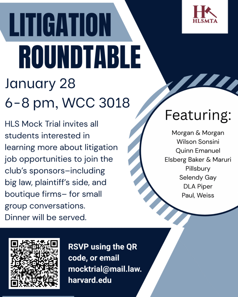 Interested in working at a litigation-focused firm? Come to the Litigation Roundtable! Attorneys from several litigation or trial focused firms will be present and students…