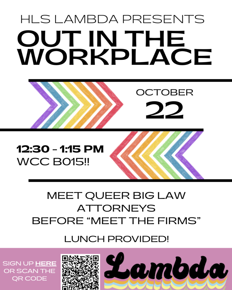 Come join Lambda (HLS’s affinity organization for the LGBTQ+ community and allied students) for lunch and our first general body meeting! Learn about the organization…